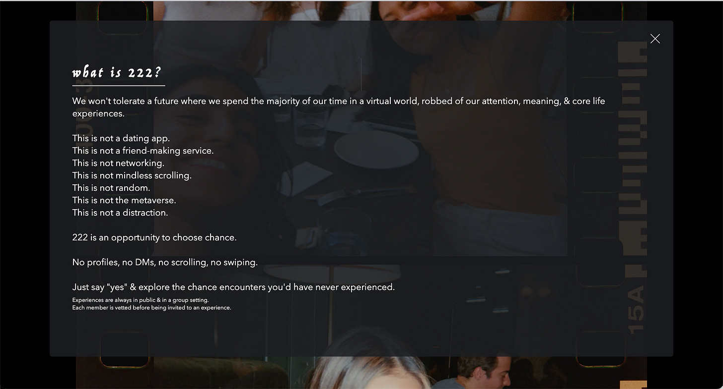 I met Miranda and intellectual bro through an algorithm, except it wasn’t Bumble BFF or Hinge. It was a newcomer promising in-person experiences leveraging the magic of AI: 222.