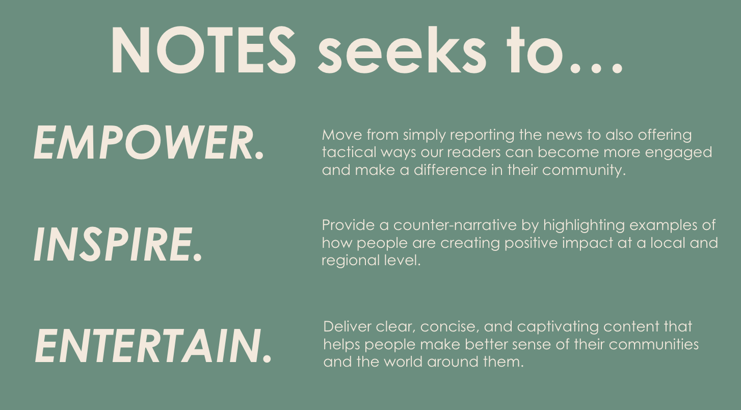 NOTES is grounded in the belief that cities are the theater in which our country’s founding principles are contested, transformative policies are piloted, and cultural trends emerge. We are guided in the pursuit of delivering clear, concise, and captivating content that helps people make sense of what’s propelling the country forward. By uplifting voices and ideas at the local level, we hope to remind people that they have the power to decide the country’s future through their daily interactions and choices - not just every four years during a national election.